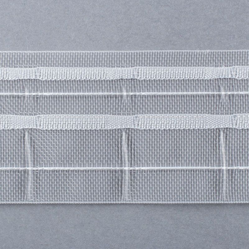 Шторная лента жесткая, прозрачная для тюлей и портьерных тканей c карандашной складкой. Сокращение - регулируемое, произвольное, 2 ряда белых текстильных кармашков, стягивается на 4 нитки, крепление - крючки.