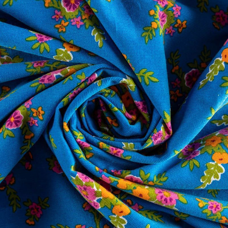 Очень приятная, мягкая, достаточно легкая яркая ткань с мелкими букетиками цветочков. Микровельвет имеет почти незаметный рубчик. Основа ткани не плотная, поэтому он отлично подойдет для пошива  платья, рубашки, ветровки или детской одежды.
