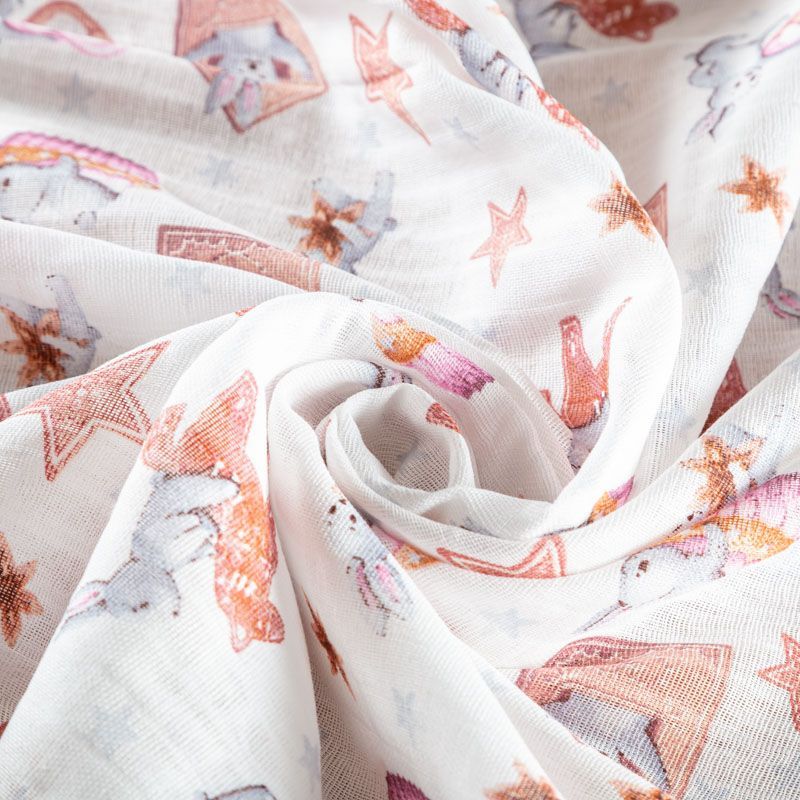 Хлопковый муслин полотняного переплетения, в котором нити утка и основы перекрывают друг друга на больших промежутках, поэтому ткань очень мягкая, легкая, частично прозрачная. Муслин используется для пошива подгузников, пелёнок, комплектов постельного белья для взрослых и детей, занавесок и пологов для детских кроваток, а также одежды.