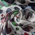 Шелковая органза с крупным ярким абстрактным принтом на молочном фоне. Имеет слегка рельефную поверхность за счет вискозы. Хорошо держит форму, легкая, тонкая, просвечивает. Подойдет на блузку, платье, тунику или юбку.