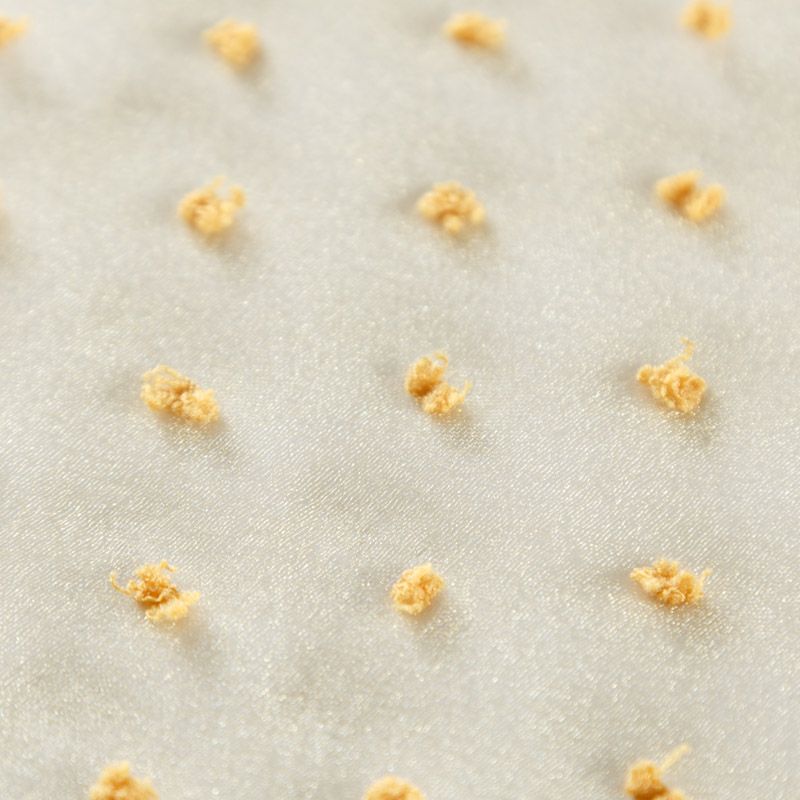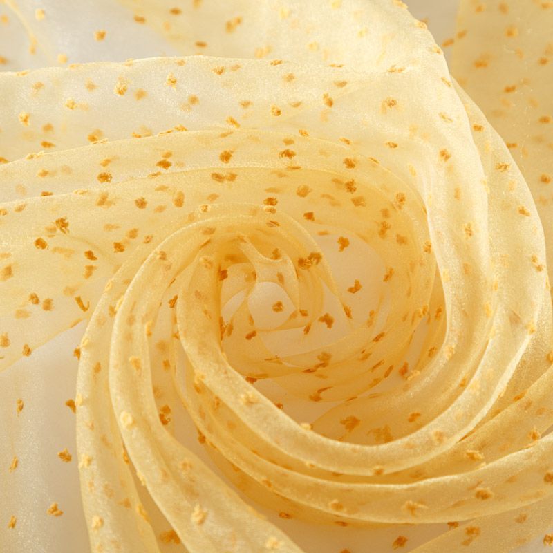 Легчайший, изящный, воздушнный и прозрачный материал с благородной переливчатой поверхностью. Прекрасно держит форму в заложеных складках. На лицевой стороне объемные декоративные элементы из флока диаметром 0.5 см. Подойдет для создания в изделии декоративных деталей, новогодних костюмов, нарядных платьев, блузок.