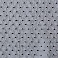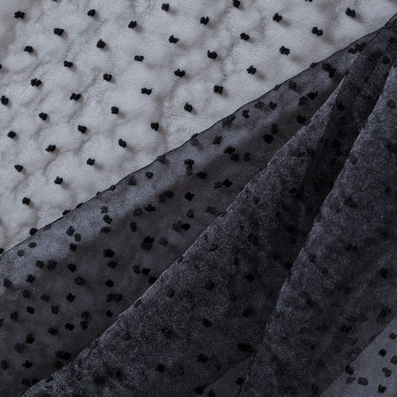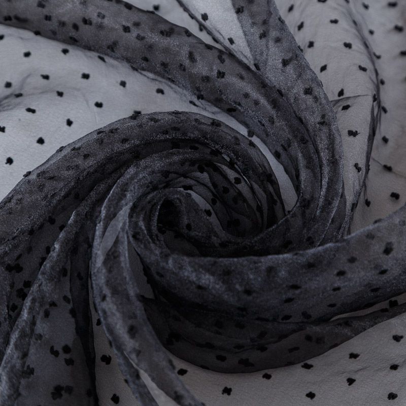 Легчайший, изящный, воздушнный и прозрачный материал с благородной переливчатой поверхностью. Прекрасно держит форму в заложеных складках. На лицевой стороне объемные декоративные элементы из флока диаметром 0.5 см. Подойдет для создания в изделии декоративных деталей, новогодних костюмов, нарядных платьев, блузок.