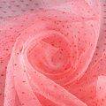 Легчайший, изящный, воздушнный и прозрачный материал с благородной переливчатой поверхностью. Прекрасно держит форму в заложеных складках. На лицевой стороне объемные декоративные элементы из флока диаметром 0.5 см. Подойдет для создания в изделии декоративных деталей, новогодних костюмов, нарядных платьев, блузок.