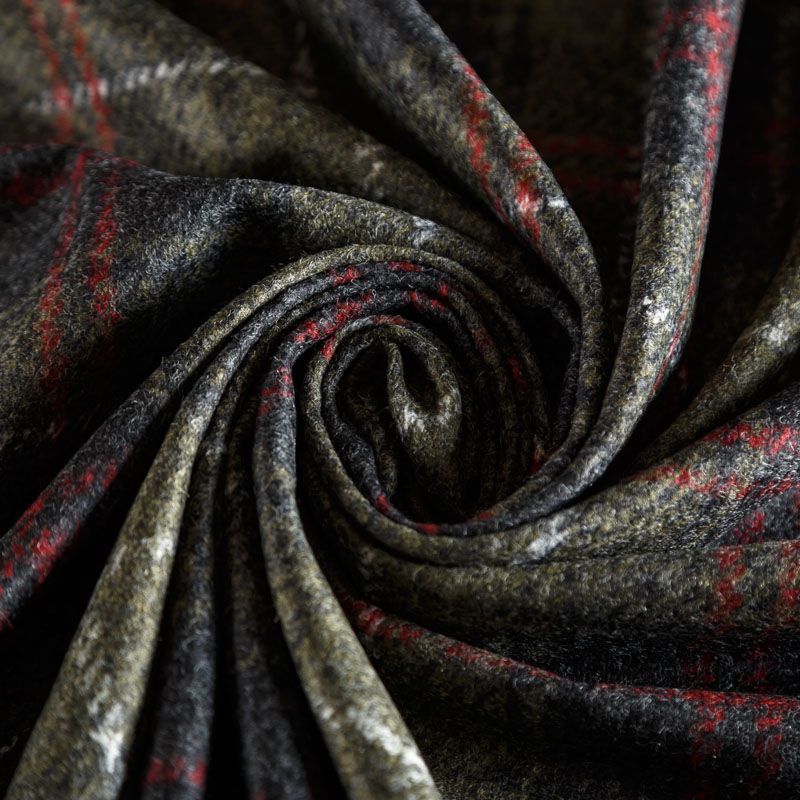 Плотный пальтовый шерстяной трикотаж в оттенке хаки. Линии белого, красного и серого цветов образуют красивую клетку. Обе стороны ткани гладкие, приваляные, срезы не осыпаются, хорошо держит форму, теплый. Идеален для пошива пальто,теплых жакетов, жилетов, кейпа, кардигана.
