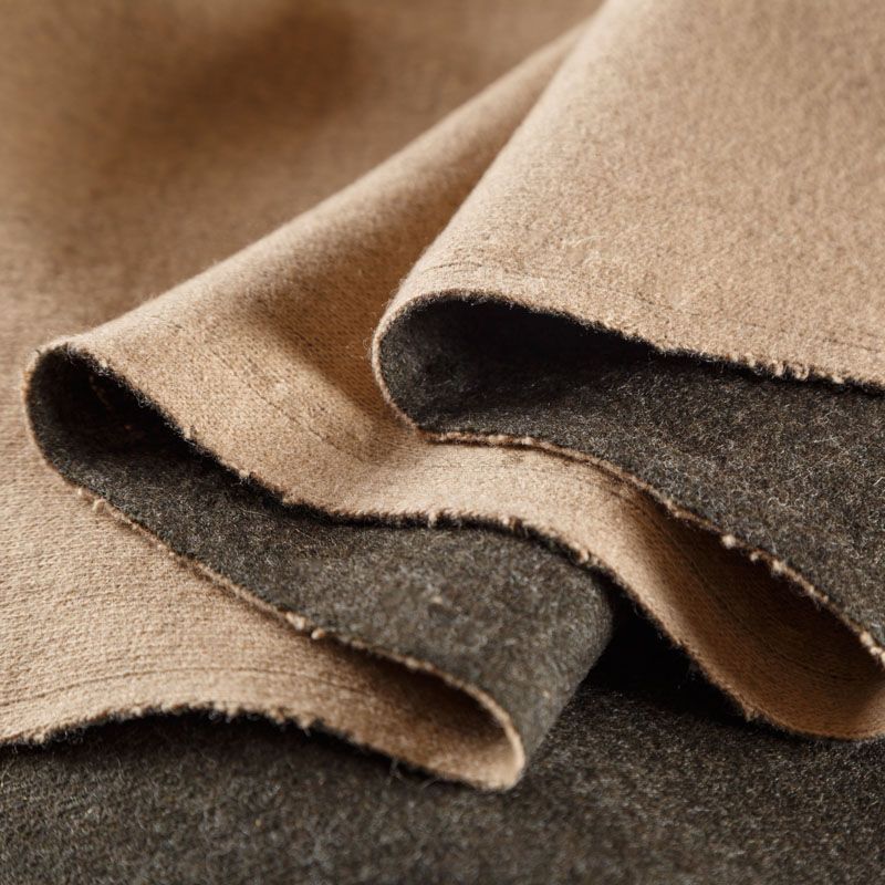 Двухслойный двусторонний итальянский шерстяной трикотаж в бежево-коричневой гамме. Полотно пластичное, приятное на ощупь, не колется, теплое и уютное. При соответствующей обработке швов одежду из этого трикотажа можно носить на обе стороны. Подойдет для пошива теплых кардиганов, пальто, костюмов, теплого платья, пончо, кейпа.