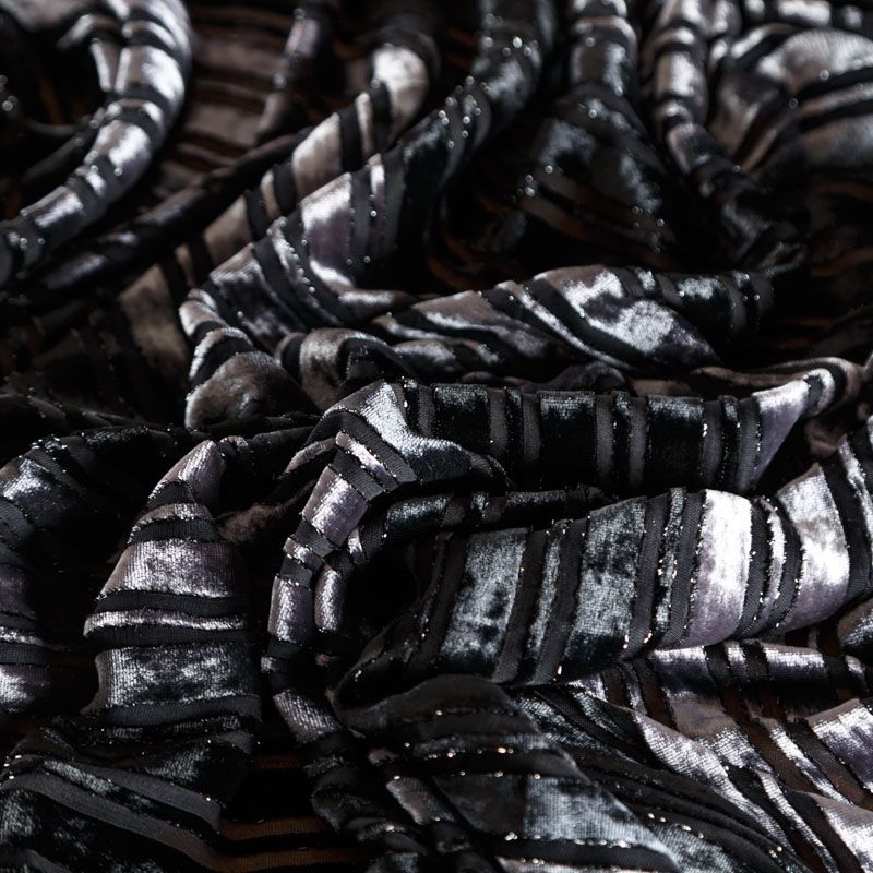 Итальянская шелковая красивая и эффектная ткань с гладким, немного глянцевым ворсовым узором на матовой шифоновой основе черного цвета. Панбархат тонкий, но объемный за счет рельефности рисунка, при драпировке ложится мягкими струящимися складками. Отлично подойдет для пошива блузы, туники, платья, костюма в пижамном стиле.