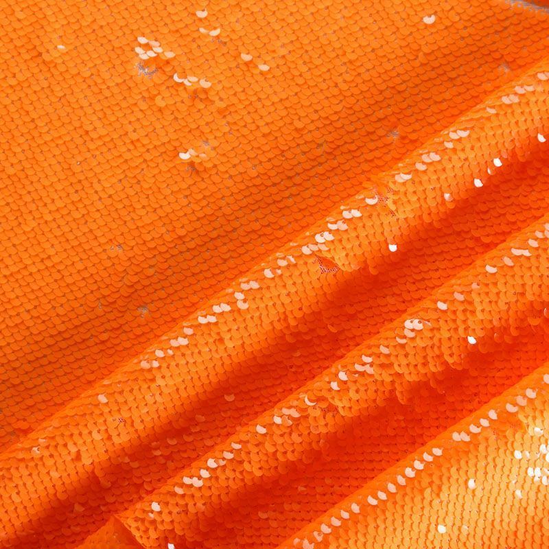 Двухсторонние пайетки неонового оранжевого оттенка, вышиты по типу чешуи на эластичной трикотажной основе белого цвета. Лицевая сторона глянцевая, изнаночная — матовая. Ткань яркая и выразительная, красиво переливается, очень нарядная, хорошо драпируется, пластичная и эластичная и в длину, и в ширину, благодаря чему изделия получаются комфортными и отлично сидят по фигуре. Пайетки — идеальный материал для праздников и вечеринок, также отлично впишутся в стиль "спорт-шик". Из них получится эффектное платье, жакет, боди, топ, туника, юбка или комбинезон.
