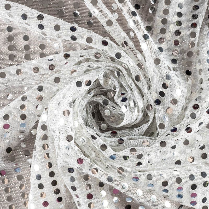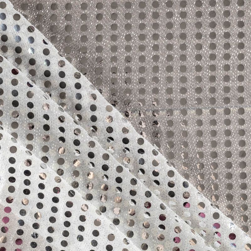 Полупрозрачный переливающийся материал, основа которого, из тонкого сетчатого трикотажа с люрексом. Полотно усеяно блестящими зеркальными круглыми пайетками диаметром 6 мм. Ткань идеально подойдет для декорирования элементов костюма, пошива вечерних нарядов, концертных и танцевальных костюмов.