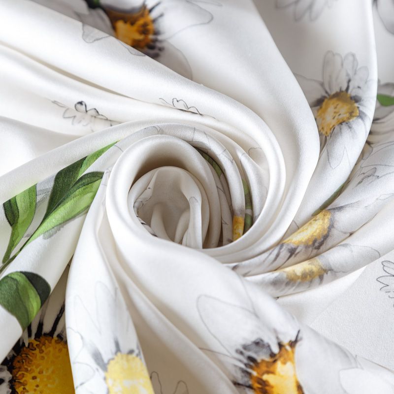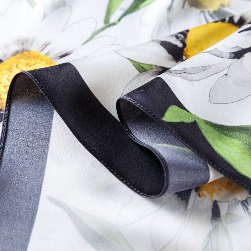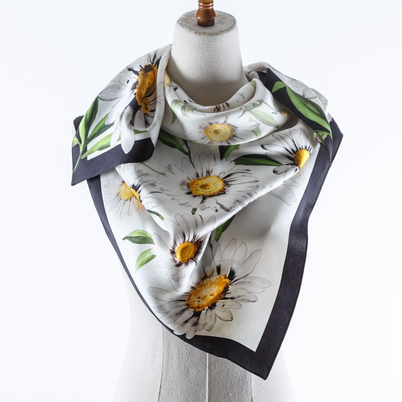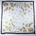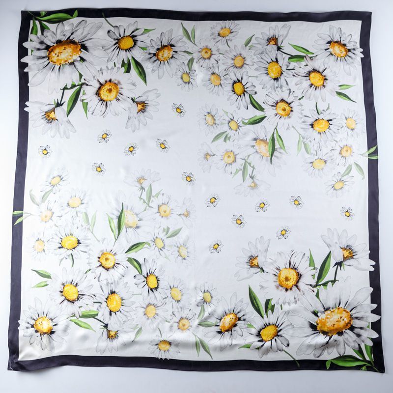 Эффектный и стильный платок с крупными ромашками на белом фоне с черным кантом. Платок выполнен из натурального итальянского шелка атласного плетения. Такой аксессуар добавит свежести и весеннего настроения в Ваш образ.