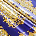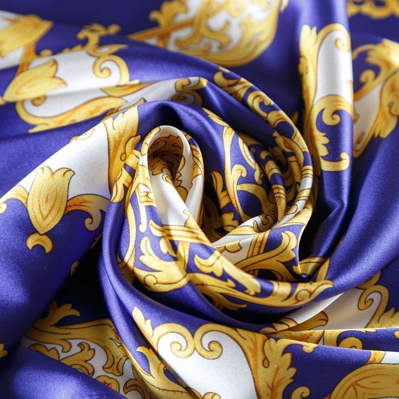 Платок выполнен из натурального итальянского атласного шелка с вензельным орнаментом на фиолетово-синем насыщенном фоне. Невесомый, воздушный, мягкий и пластичный, летящий, поверхность с красивым матовым блеском. Будет отличным стильным аксессуаром к платью, костюму, жакету или пальто.