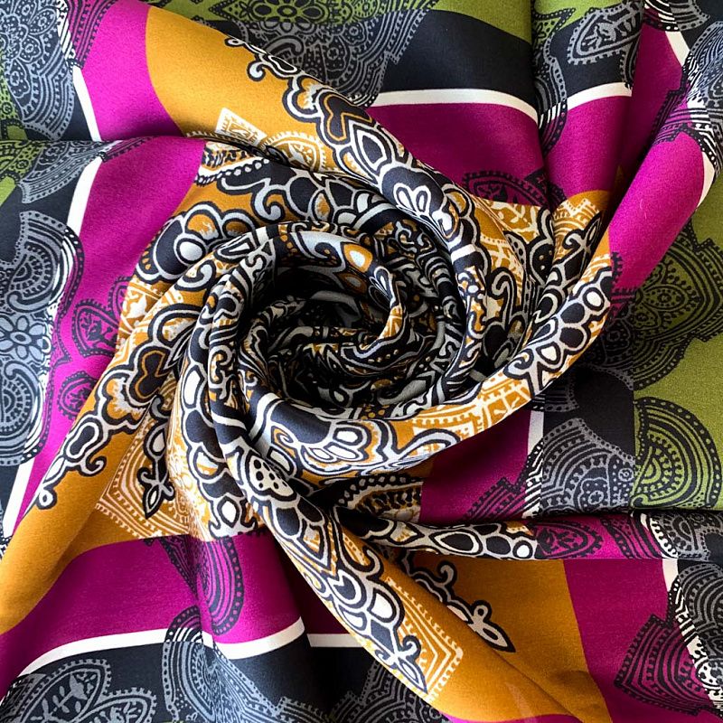 Платок выполнен из натурального итальянского шелка с этническим орнаментом на фоне сочетания цветных квадратов. Невесомый, воздушный, мягкий и пластичный, летящий, поверхность с красивым матовым блеском. Будет отличным стильным аксессуаром к платью, костюму, жакету или пальто.