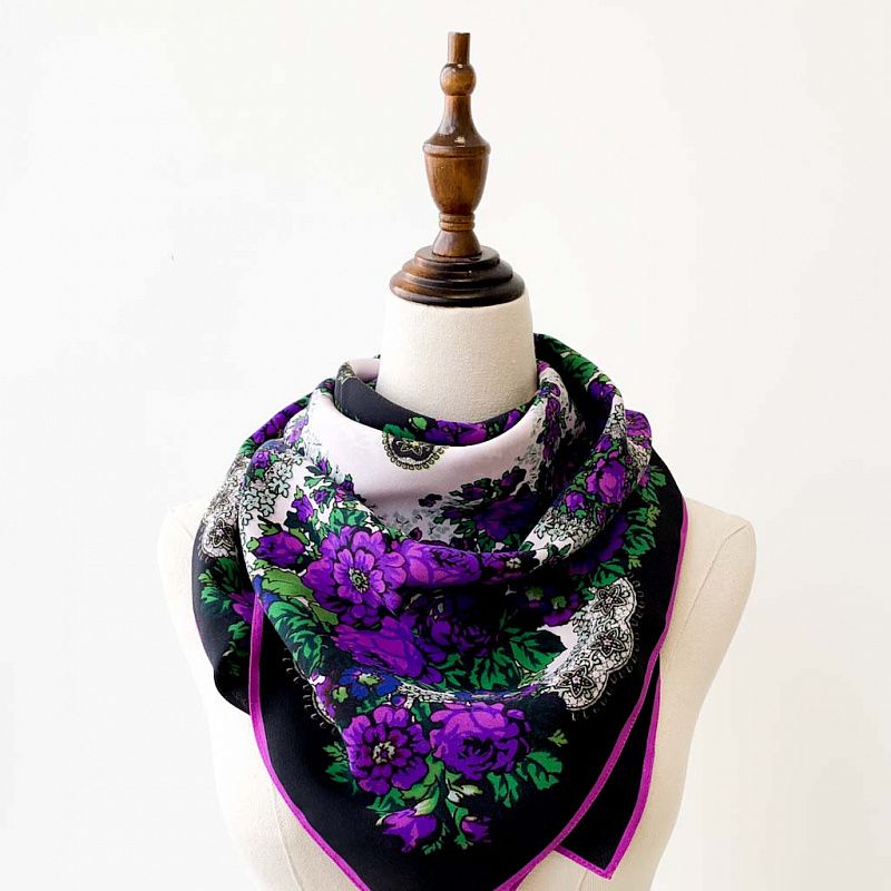 Платок выполнен из натурального итальянского шелка с креповой поверхностью. Очень красивый рисунок в фольклорном стиле по типу павлопосадских узоров в фиолетовом цвете на черном фоне. Шикарная вещь украсит образ и будет отличным дополнением к Вашему наряду.