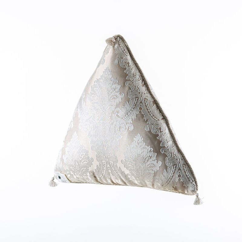 Оригинальная треугольная дизайнерская подушка 55х55х55 см. Выполнена из жаккарда и декорирована кисточками и витым шнуром. Потайная молния расположена в нижнем шве. Декоративные подушки сделают акцет на цветовой гамме Вашего помещения, подчеркнут особенности интерьерного стиля или тематику оформления. Внутреннее наполнение синтепон в хлопковом чехле.