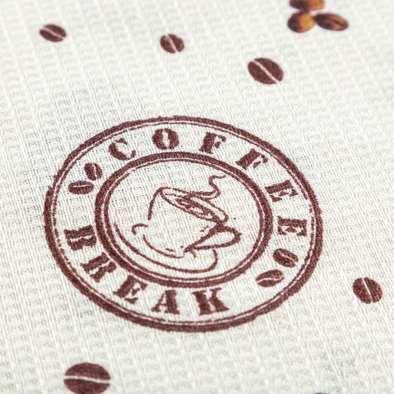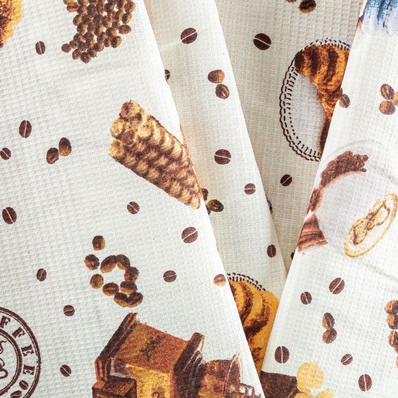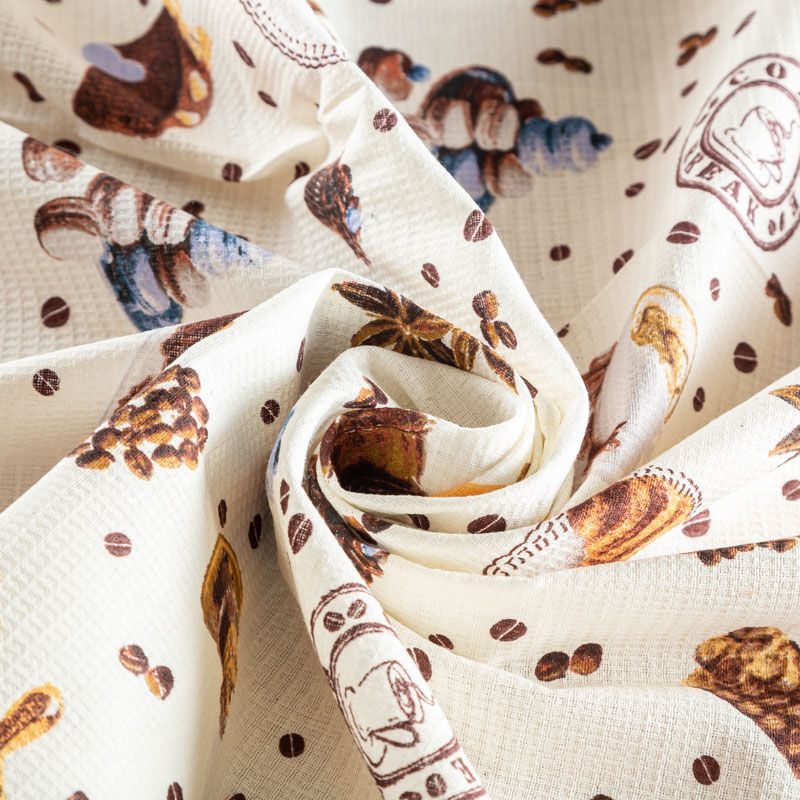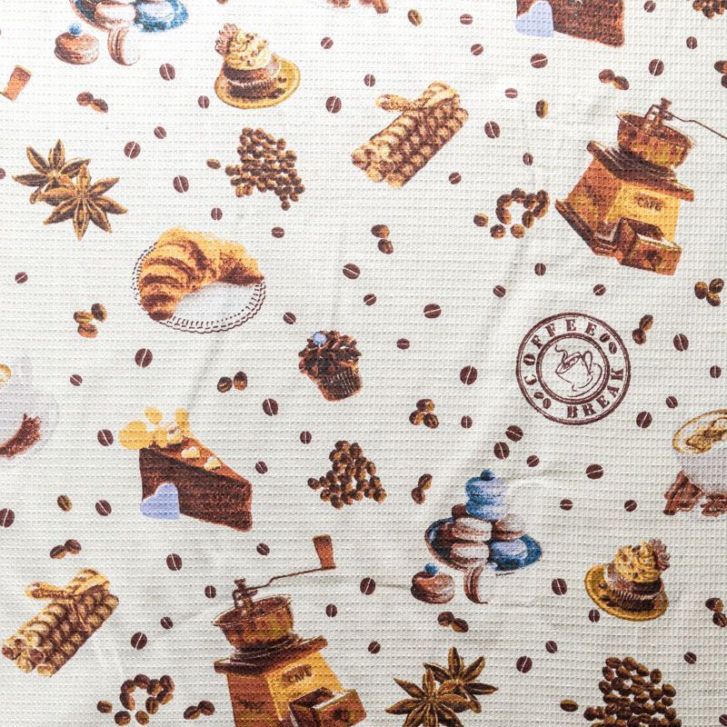 Качественная натуральная хлопчатобумажная ткань, обладающая высокой гигроскопичностью, с принтом на кофейную тему. Универсальный материал, из которого  шьют кухонные полотенца, скатерти, прихватки, салфетки.