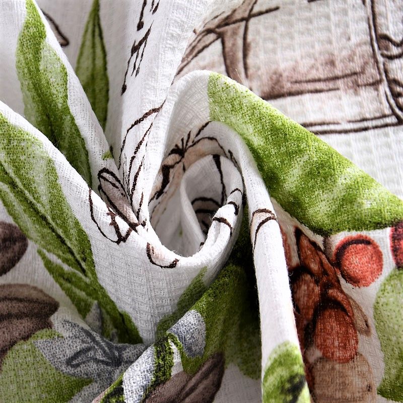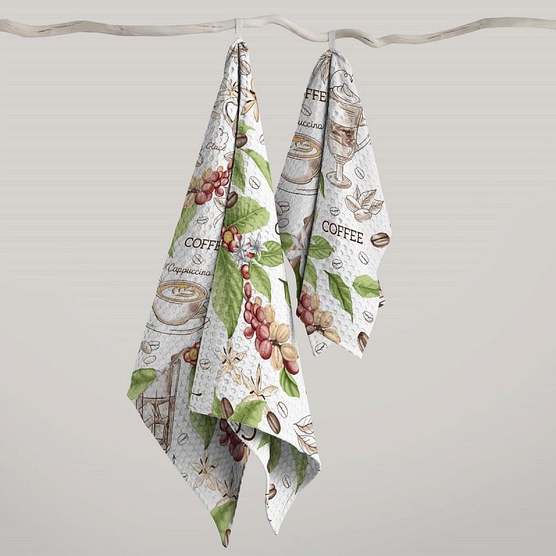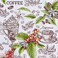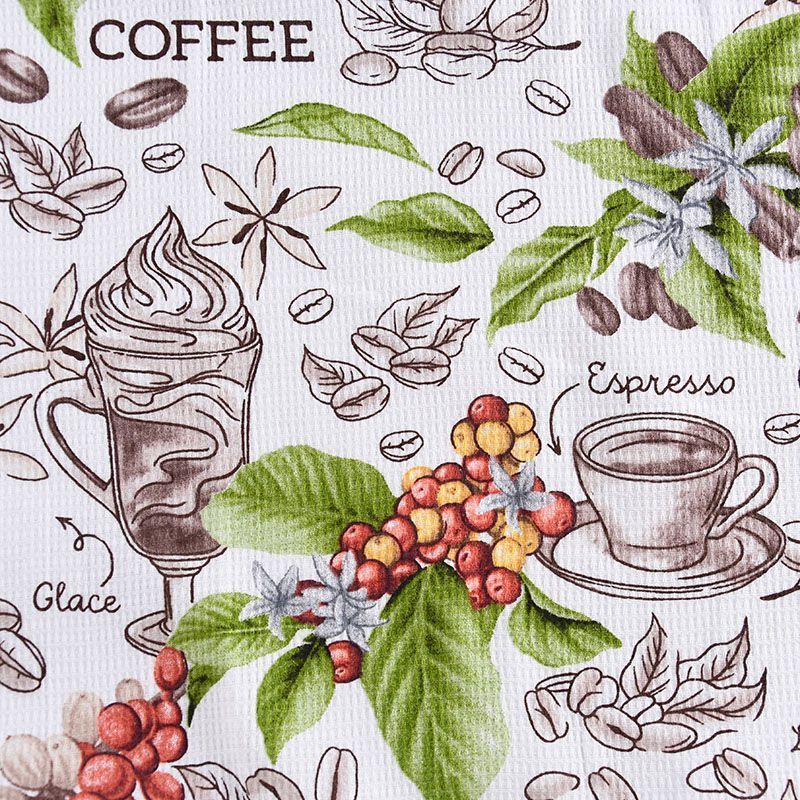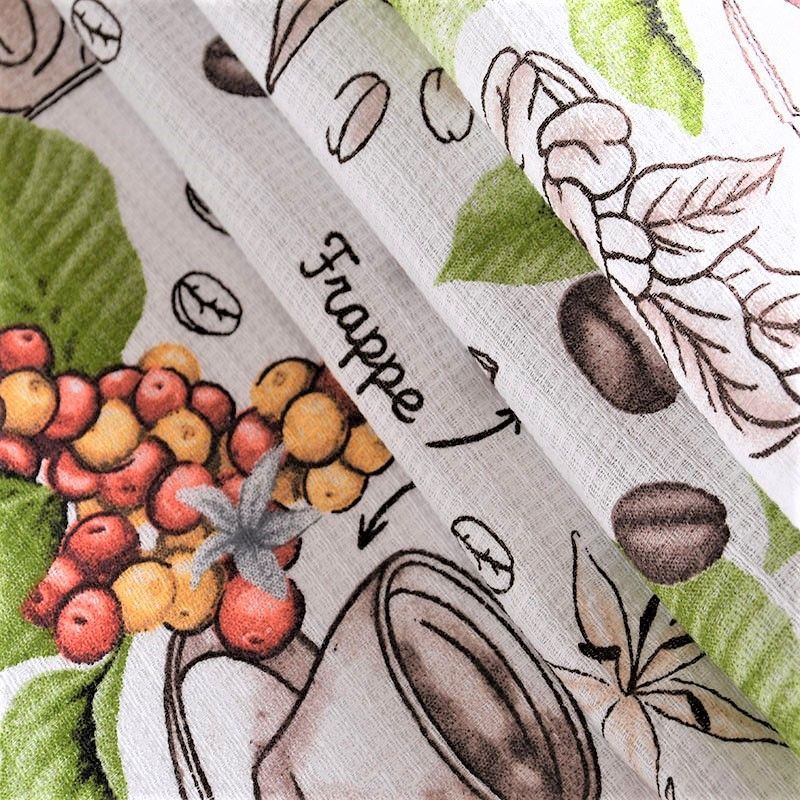 Качественная натуральная хлопчатобумажная ткань, обладающая высокой гигроскопичностью, с принтом на кофейную тему. Универсальный материал, из которого  шьют кухонные полотенца, скатерти, прихватки, салфетки.