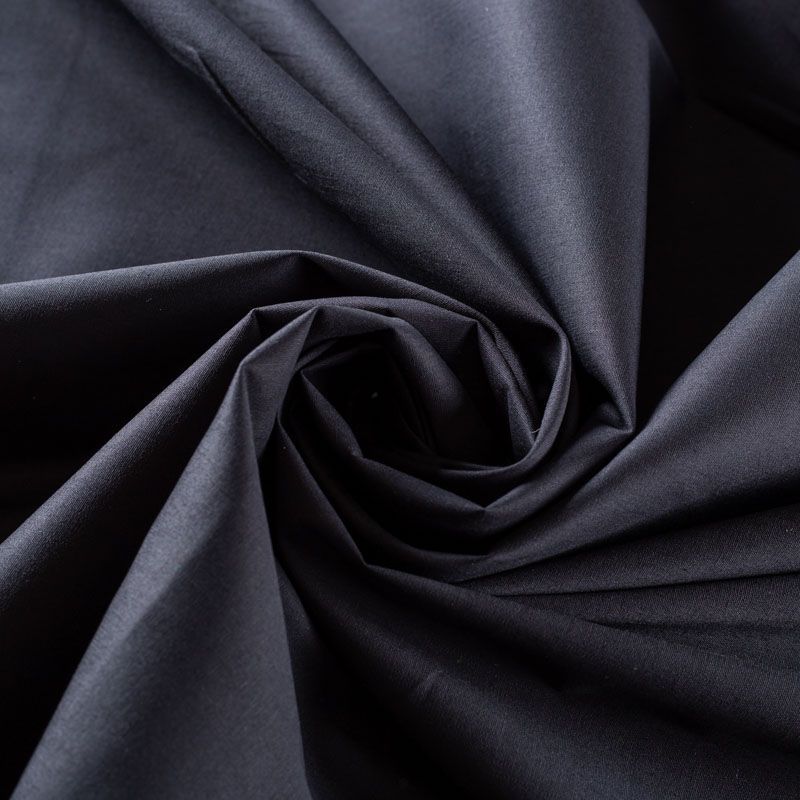 Однотонный плательно-рубашечный хлопковый поплин черного цвета. Ткань лёгкая, слегка прозрачная, поверхность матовая, гладкая, приятная к телу, хорошо драпируется, тянется за счет эластана в составе. Прекрасно подойдет блузы, платья-рубашки, летнего сарафана, туники.