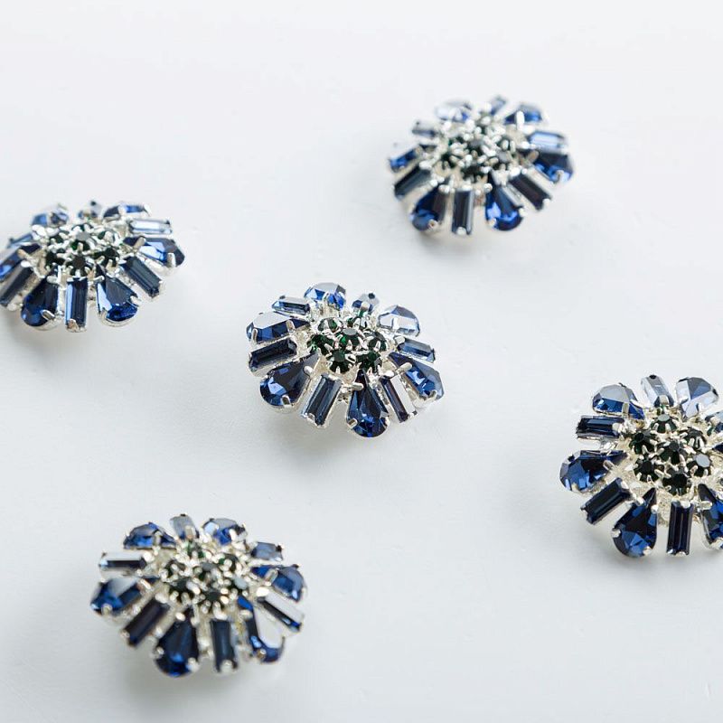 Круглые пришивные, не тяжелые пуговицы, изготовленные прессовым способом из сплава с кристаллическим стеклом сапфирового оттенка. Прекрасно подойдут для различных изделий сегмента верхней одежды, костюмов, вязанной одежды, в качестве украшений.