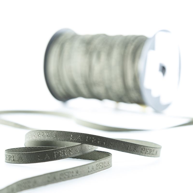 Бретелечная резинка используется для обработки стана бюстгальтера, а также для бретелей. Матовая с жаккардовой надписью бренда. Края ровные.