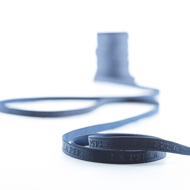 Бретелечная резинка используется для обработки стана бюстгальтера, а также для бретелей. Матовая с жаккардовой надписью бренда. Края ровные.