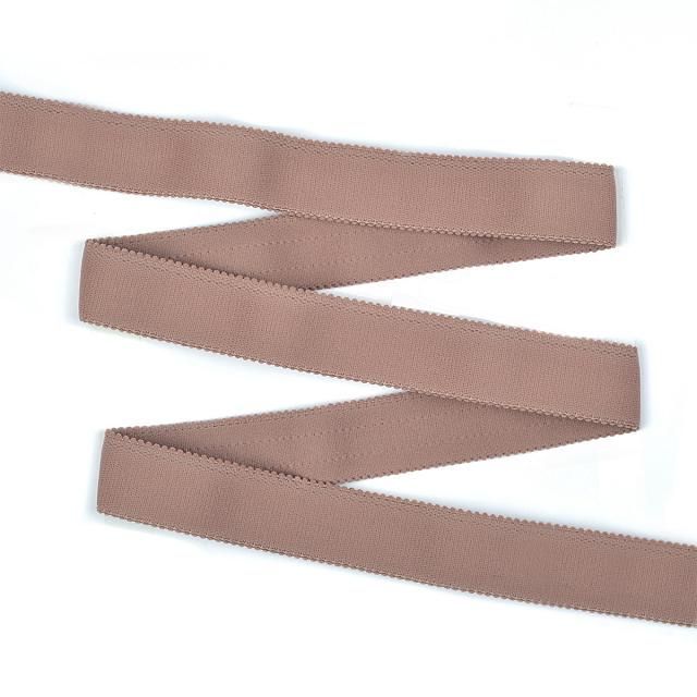 Классическая бретелечная резинка используется для обработки стана бюстгальтера, а также для бретелей. Края фигурные, матовая. Плотность 18 ± 0.3 г/м. Растяжимость 50 ± 10 %.
