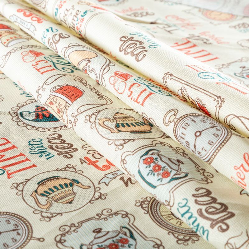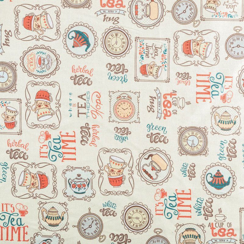 Ткань рогожка с цветным "кухонным" принтом на кремовом фоне. Это плотная хлопковая ткань с переплетением нитей две на две, благодаря этому создаётся структурное полотно отлично подходящее для пошива скатертей и салфеток, фартуков, сценических костюмов. Набирается объемом.