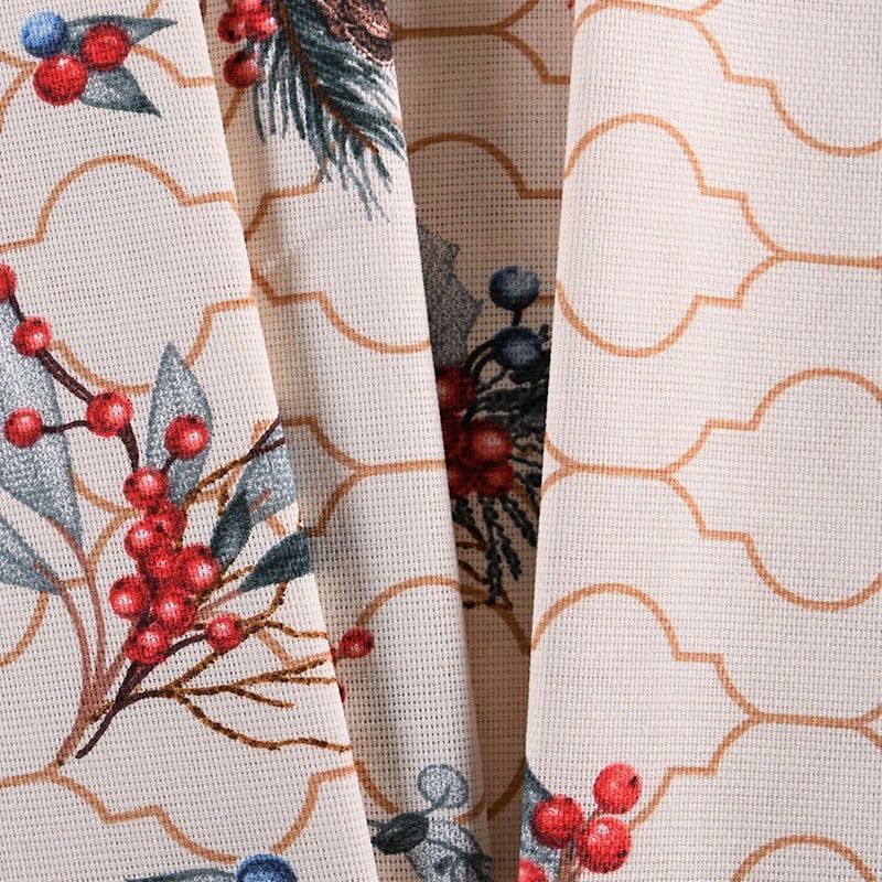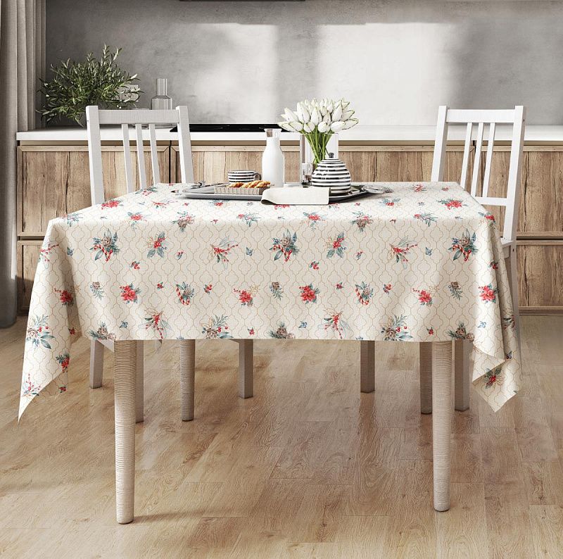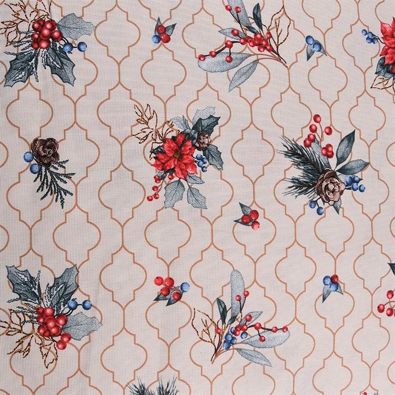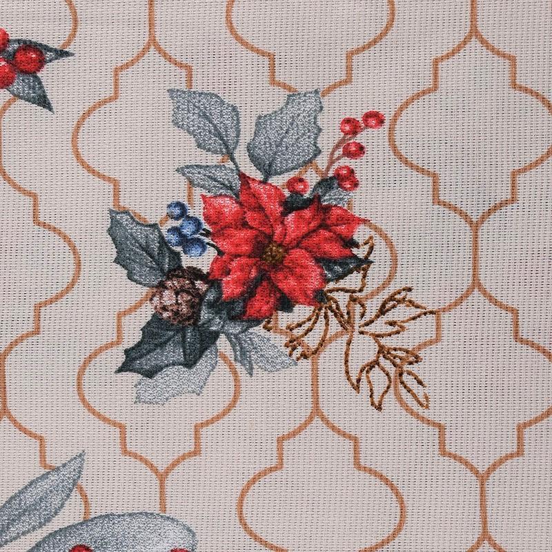 Ткань рогожка с рождественским принтом на бежевом фоне. Это плотная хлопковая ткань с переплетением нитей две на две, благодаря этому создаётся структурное полотно отлично подходящее для пошива скатертей и салфеток, фартуков.