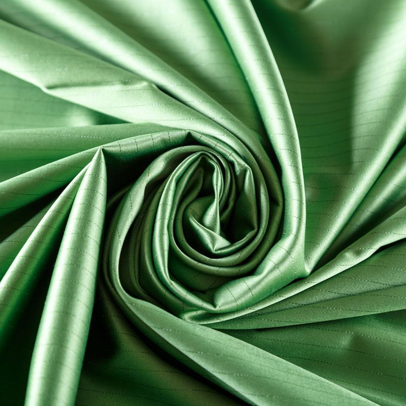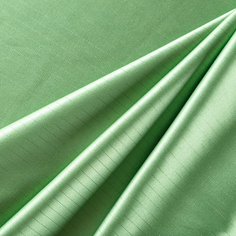 Сатин-коттон в зеленом оттенке с тонкими полосками люрексовой нити. Поверхность гладкая со сдержанным блеском, ткань средней плотности,  не толстая, хорошо держит форму, тянется за счет эластана в составе. Подойдет для пошива костюма, жакета, юбки, платья, брюк или шорт.