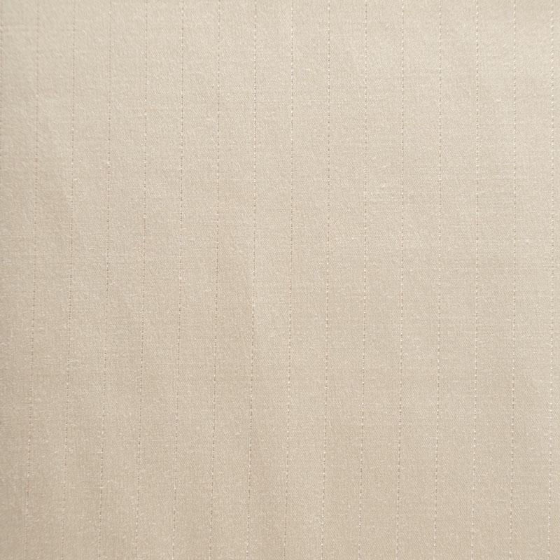 Сатин-коттон в бежевом оттенке с тонкими полосками люрексовой нити. Поверхность гладкая со сдержанным блеском, ткань средней плотности,  не толстая, хорошо держит форму, тянется за счет эластана в составе. Подойдет для пошива костюма, жакета, юбки, платья, брюк или шорт.