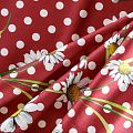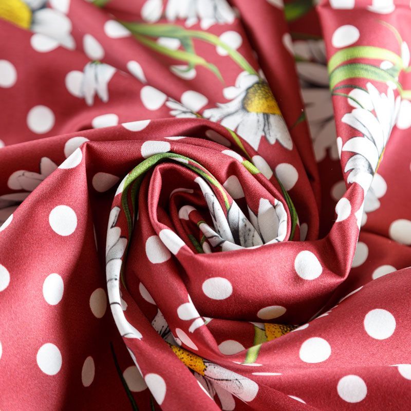 Итальянский сатин-коттон бордового цвета с крупным цветочным принтом. Поверхность гладкая со сдержанным блеском, ткань средней плотности, не толстая, хорошо держит форму, тянется за счет эластана в составе. Подойдет для пошива костюма, жакета, юбки, платья, брюк или шорт.