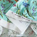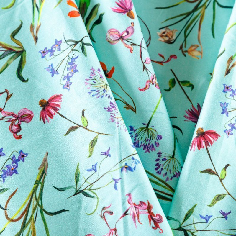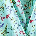 Итальянский сатин-коттон в мятном оттенке с цветочным весенним принтом. Поверхность гладкая со сдержанным блеском, ткань средней плотности,  не толстая, хорошо держит форму, тянется за счет эластана в составе. Подойдет для пошива костюма, жакета, юбки, платья, брюк или шорт.