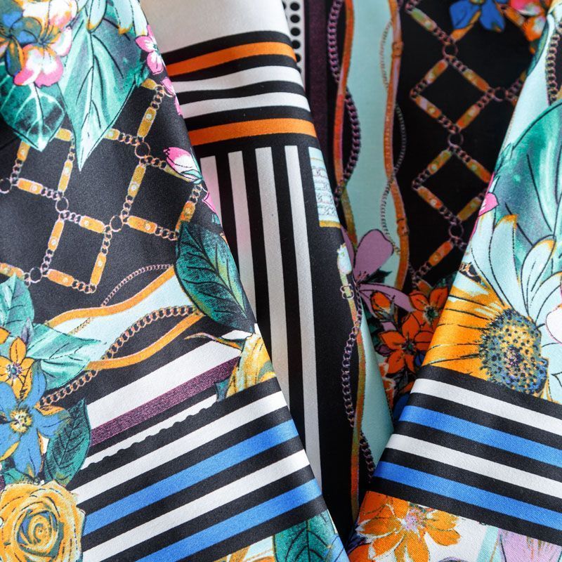 Сатин-коттон в мятном цвете с абстрактно-цветочным принтом. Поверхность гладкая со сдержанным блеском, ткань средней плотности, не толстая, хорошо держит форму, тянется за счет эластана в составе. Подойдет для пошива костюма, жакета, юбки, платья, брюк или шорт.