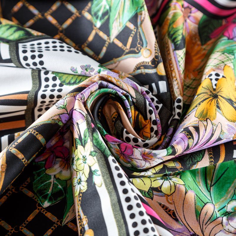 Сатин-коттон в белом цвете с абстрактно-цветочным принтом. Поверхность гладкая со сдержанным блеском, ткань средней плотности, не толстая, хорошо держит форму, тянется за счет эластана в составе. Подойдет для пошива костюма, жакета, юбки, платья, брюк или шорт.