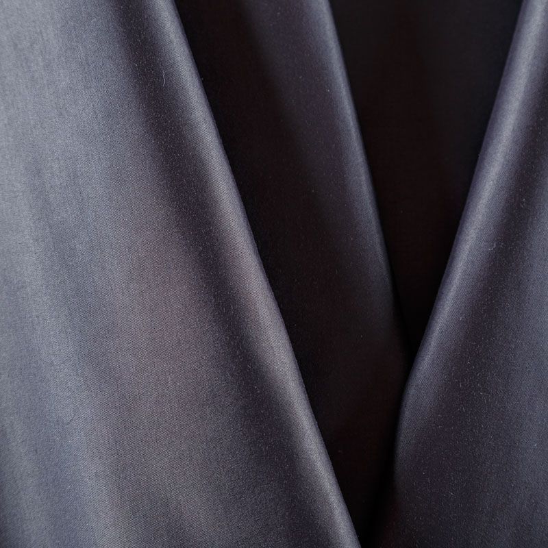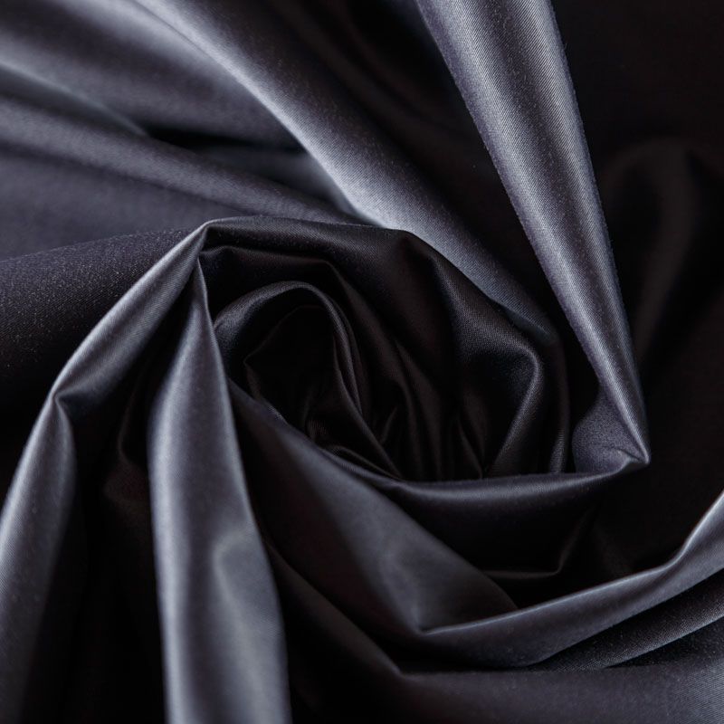 Сатин-коттон в черном цвете, с гладкой поверхностью со сдержанным блеском, ткань средней плотности, не толстая, хорошо держит форму, тянется за счет эластана в составе. Подойдет для пошива костюма, жакета, юбки, платья, брюк или шорт.