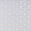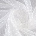 Тонкое, нежное, мягкое и прозрачное полотно, состоящее из мелких ячеек, на которых нанесен рельефный плетеный принт в виде тонких полосок с горошинами. Красиво драпируется, тянется, применяется для декорирования деталей одежды, например, рукавов изделия, для пошива нарядной и повседневной одежды: топов, блузок, пышных юбок и платьев.