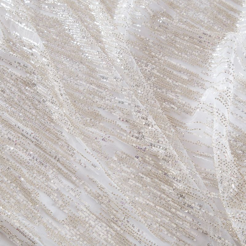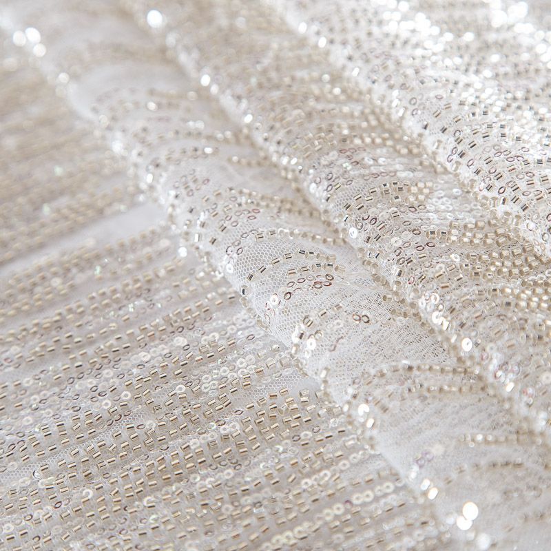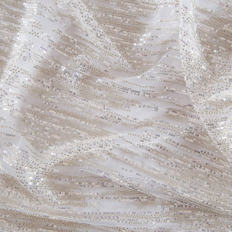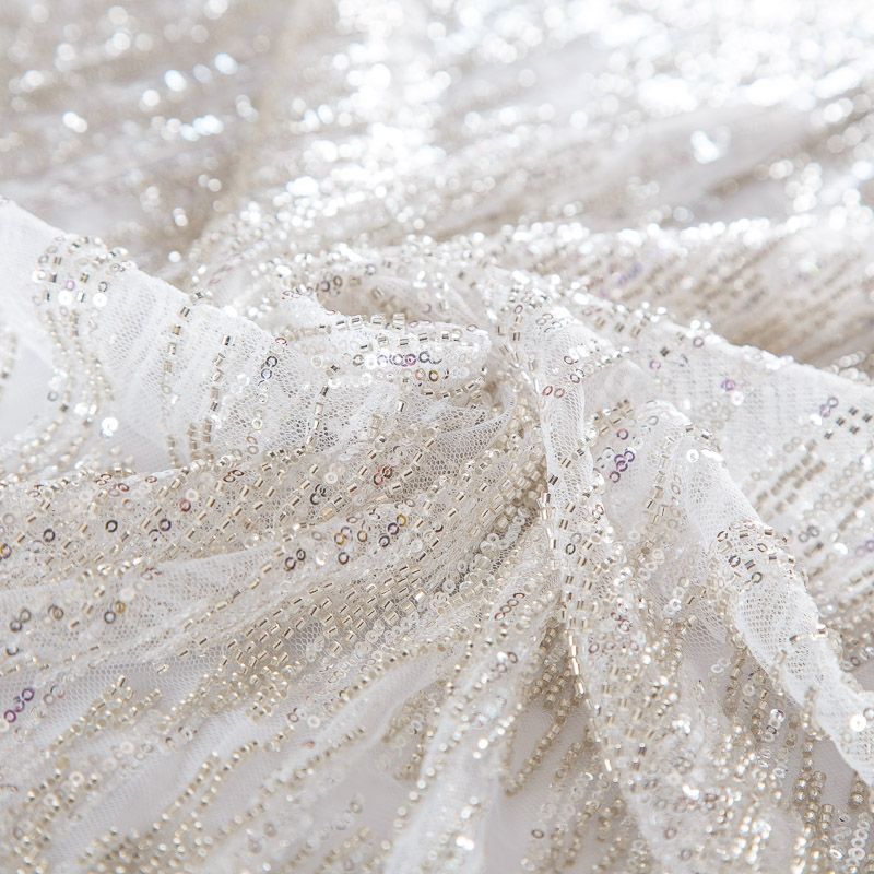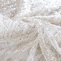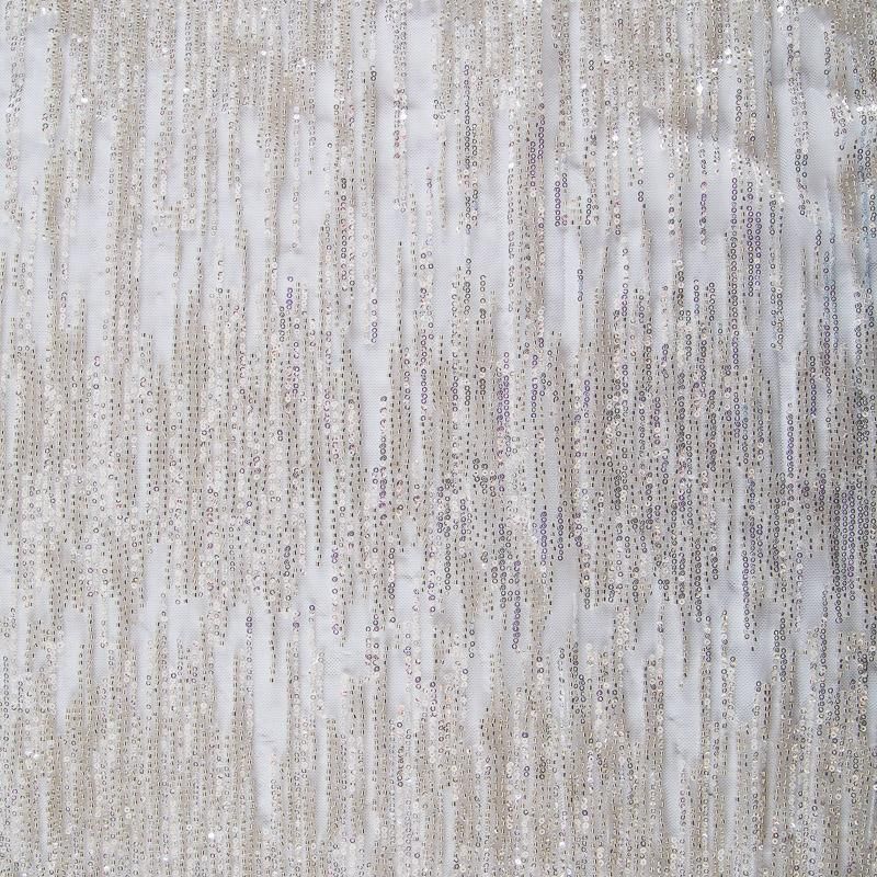 Мягкая сетка, густо расшитая пайетками и стеклярусом в тон полотна. Узор напоминает северное сияние, расположен по ширине полотна. Подходит для пошива нарядной одежды, платья, юбки, комбинезона. Требуется подклад, материал набирается объемом.