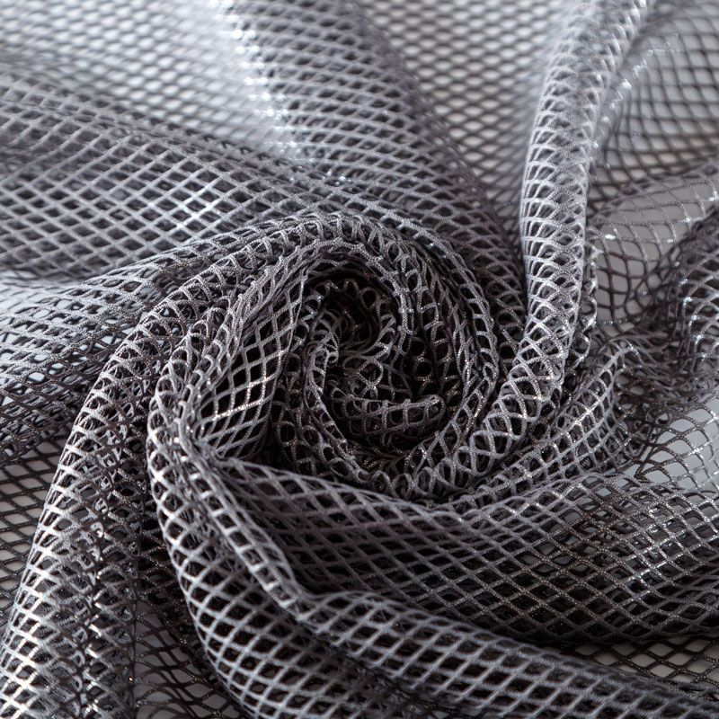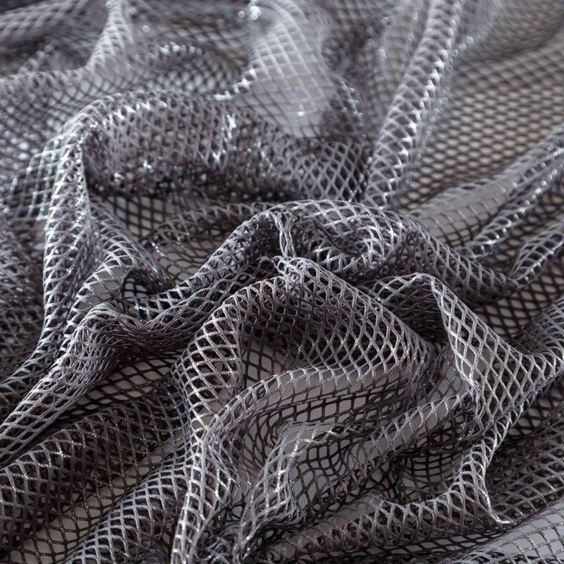 Рельефный полупрозрачный материал с сетчатой структурой. Поверхность полотна с металлизированным напылением, которое придает материалу легкий блеск и мерцание. Полотно мягкое, растяжимое во всех направлениях. Сетки нашли свое применение в процессе пошива и последующего декора вечерних нарядов, свадебных платьев, спортивной одежды, театральных костюмов.