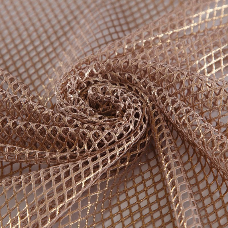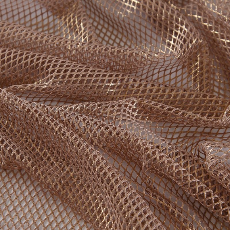 Рельефный полупрозрачный материал с сетчатой структурой. Поверхность полотна с металлизированным напылением, которое придает материалу легкий блеск и мерцание. Полотно мягкое, растяжимое во всех направлениях. Сетки нашли свое применение в процессе пошива и последующего декора вечерних нарядов, свадебных платьев, спортивной одежды, театральных костюмов.