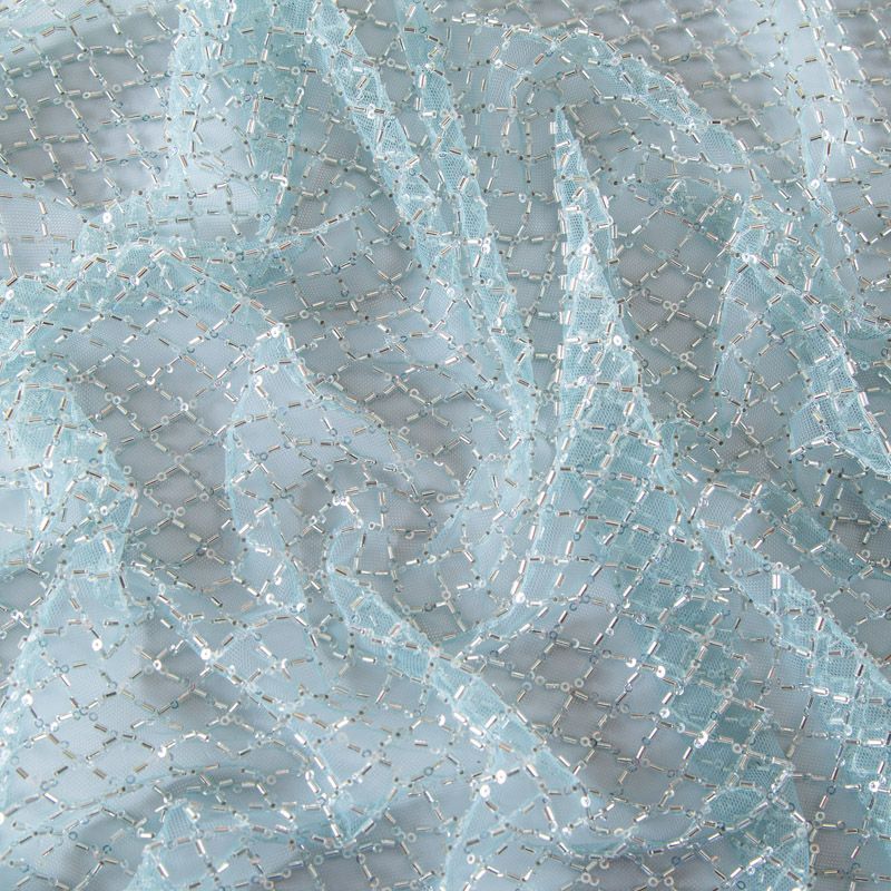 Эластичная мягкая сетка мятного оттенка, расшитая прозрачным стеклярусом. Геометрический дизайн делает полотно универсальным в использовании. Итальянская сетка прекрасно подходит для пошива праздничных нарядов, платьев, юбок и топов для торжественных случаев, а также отделки аксессуаров.