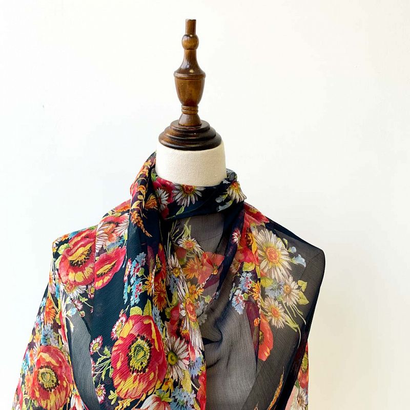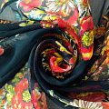 Шарф выполнен из шелкового шифона креш темно-синего оттенка с яркими букетами полевых цветов. Невесомый, воздушный, мягкий и пластичный, летящий, поверхность фактурная, жатая, с красивым матовым блеском. Будет отличным стильным аксессуаром к летнему платью, костюму, пальто.