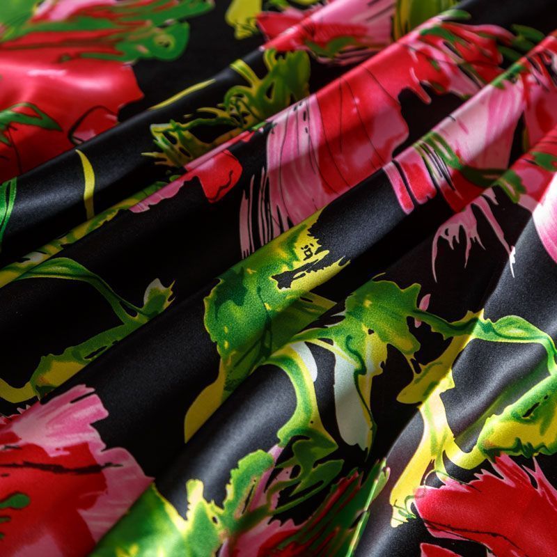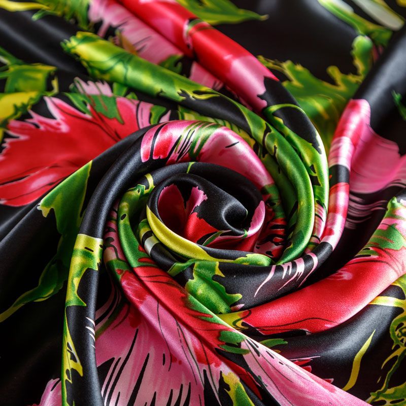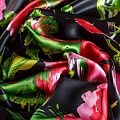 Итальянский атласный шелк с ярким цветочным принтом на черном фоне. Ткань тонкая, не просвечивает, отлично драпируется, легкая и струящаяся. Идеально подойдет для пошива платьев и сарафанов расклешенных моделей, с воланами, летящих юбок, топов, блузки, костюма в пижамном стиле.