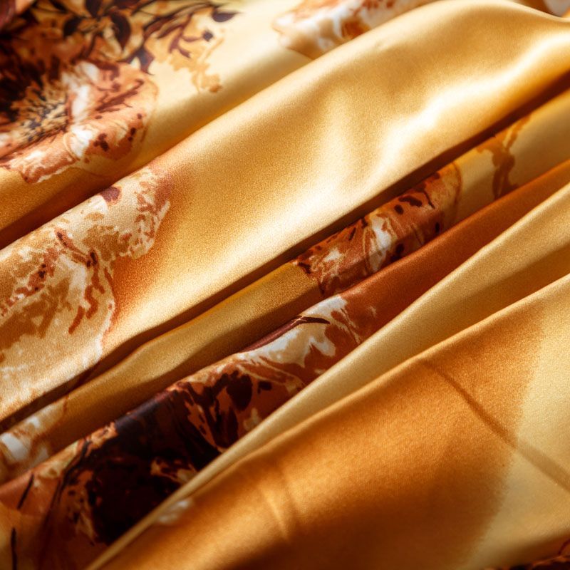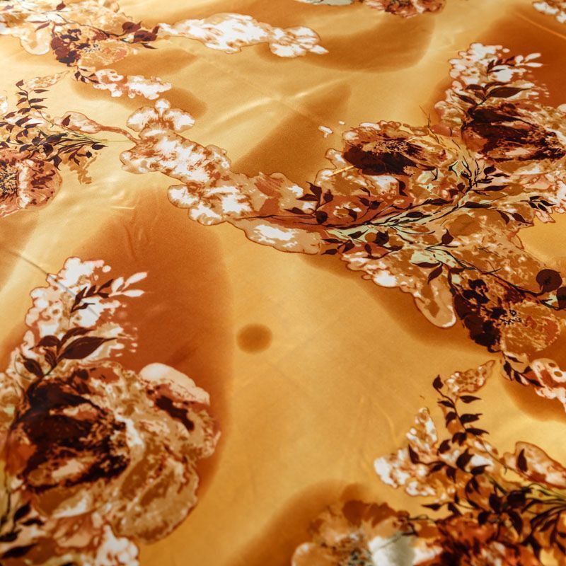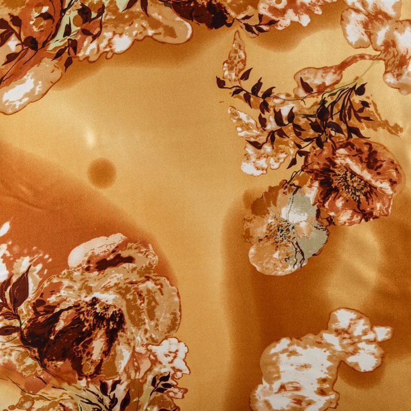 Итальянский атласный шелк с растительным принтом на золотисто-карамельном фоне. Ткань тонкая, не просвечивает, отлично драпируется, легкая и струящаяся. Идеально подойдет для пошива платьев и сарафанов расклешенных моделей, с воланами, летящих юбок, топов, блузки, костюма в пижамном стиле.