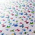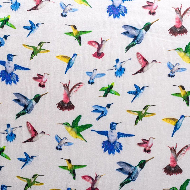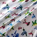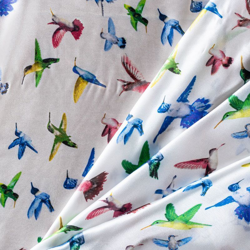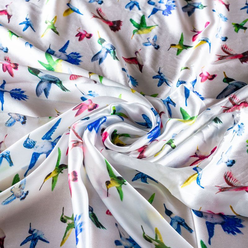 Итальянский атласный шелк с разноцветными колибри на жемчужно-белом фоне, тонкий, прозрачный, потребуется подклад, отлично драпируется, легкий и струящийся. Идеально подойдет для пошива платьев и сарафанов расклешенных моделей, с воланами, летящих юбок, топов, блузки, костюма в пижамном стиле.
