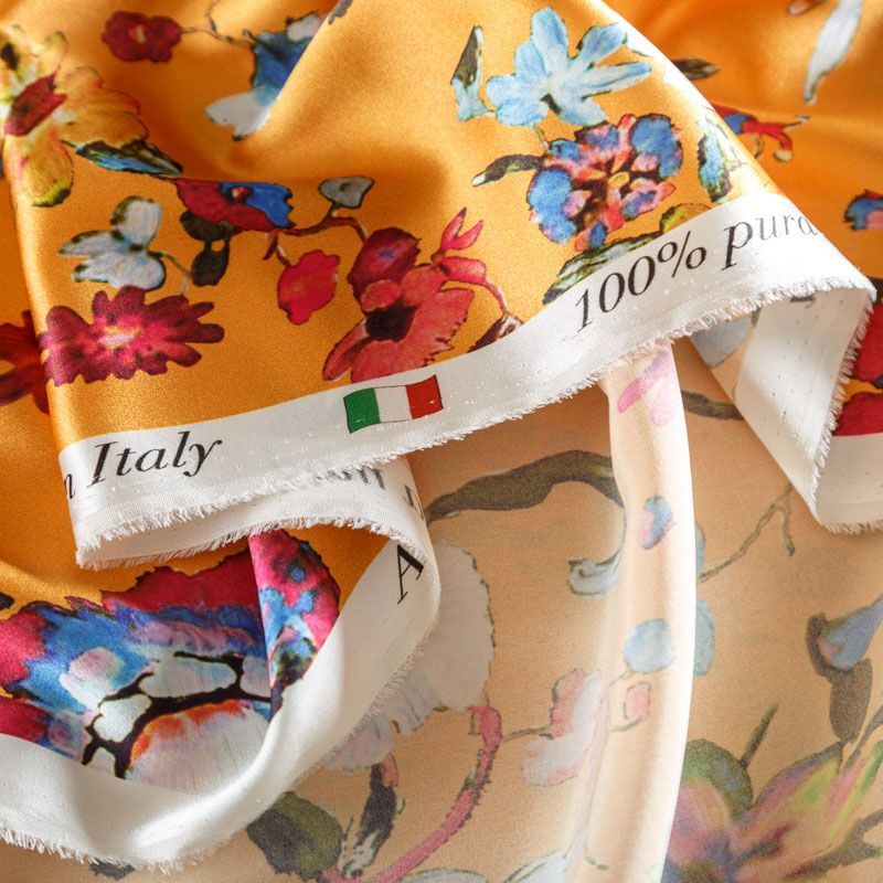 Итальянский атласный шелк со стилизованным цветочным принтом на ярком фоне. Ткань тонкая, не просвечивает, отлично драпируется, легкая и струящаяся, тянется за счет эластана в составе. Идеально подойдет для пошива платьев и сарафанов расклешенных моделей, с воланами, летящих юбок, топов, блузки, костюма в пижамном стиле.