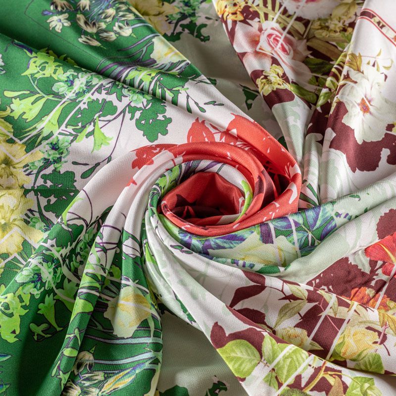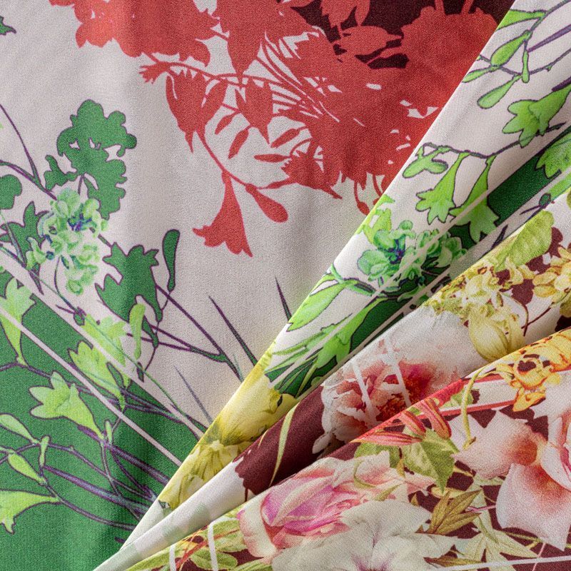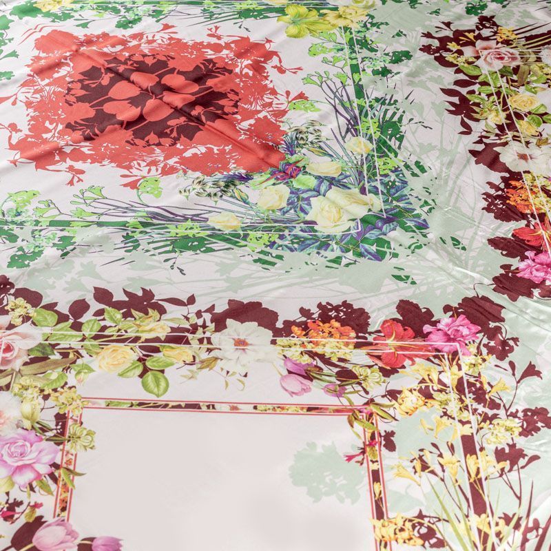 Итальянский атласный шелк со сложным растительно-геометрическим принтом. Ткань тонкая, не много просвечивает, струится, хорошо драпируется. Поверхность глядкая, имеет благородный сатиновый блеск. Подойдет для смелых образов: летних платьев и сарафанов, как летящих фасонов, так и скроенных по косой, накидок, юбок, блузок, костюмов, широких брюк, домашней одежды.