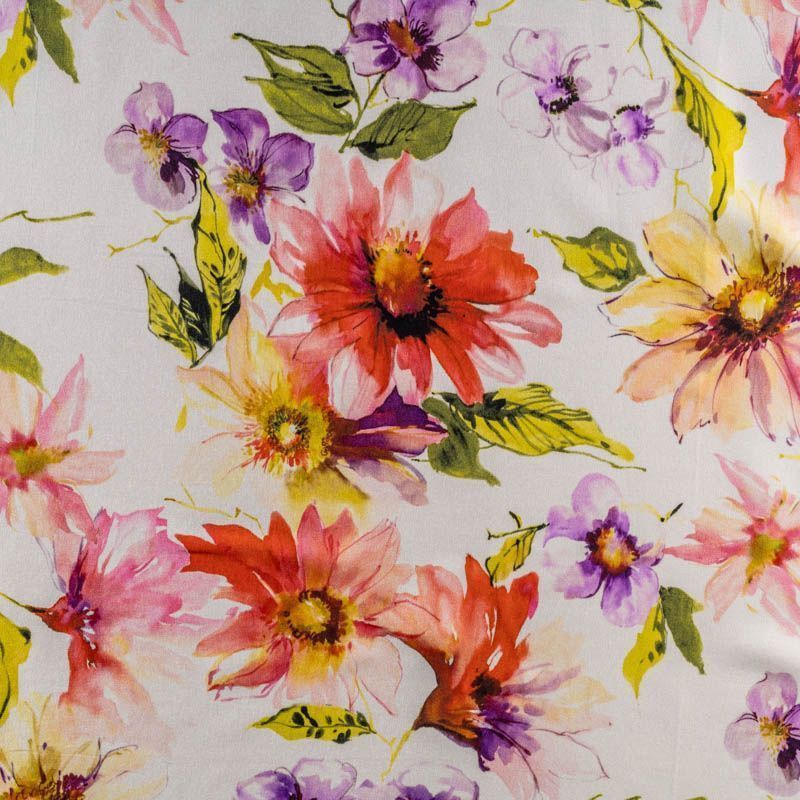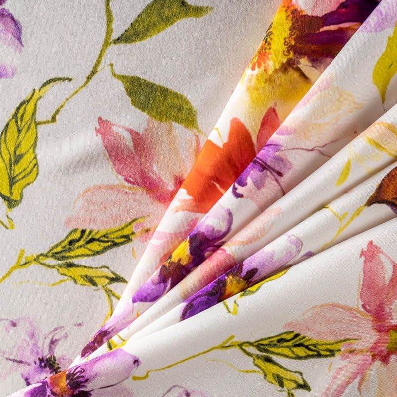 Итальянский матовый шелк с акварельным цветочным  принтом на молочном фоне, тонкий, слегка прозрачный, отлично драпируется, тянется за счет эластана в составе, легкий и струящийся с креповой поверхностью. Идеально подойдет для пошива платьев и сарафанов расклешенных моделей, с воланами, летящих юбок, топов, блузки, костюма в пижамном стиле.