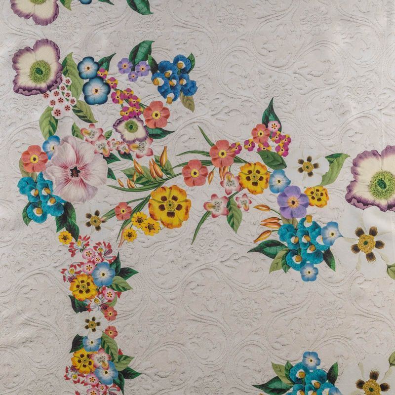 Итальянский атласный шелк с ярким цветочным принтом на фоне, имитурующем жаккардовый узор. Ткань средней плотности, не просвечивает, струится, хорошо драпируется. Поверхность гляпдкая, имеет благородный сатиновый блеск. Подойдет для летних платьев накидок, юбок, блузок, костюмов, широких брюк, домашней одежды.