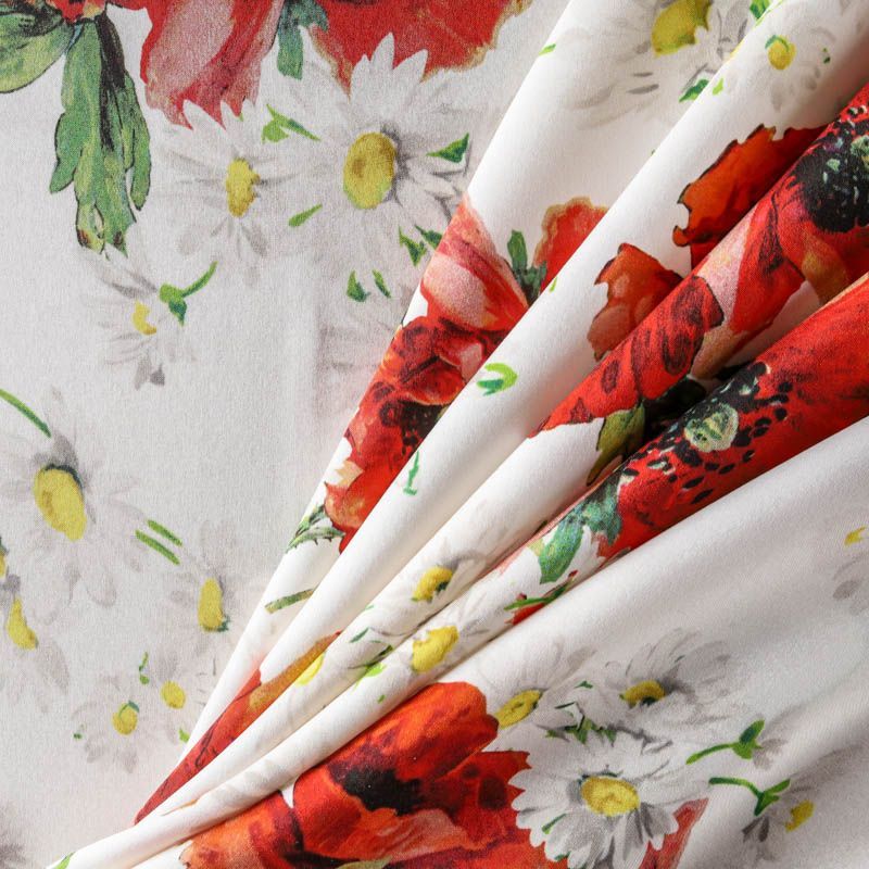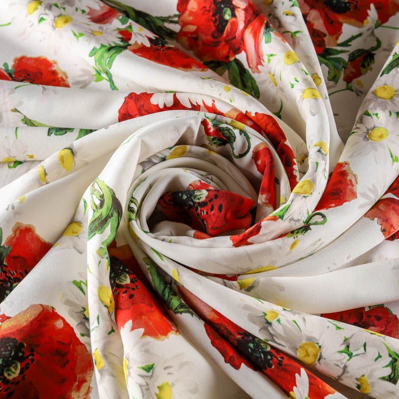 Итальянский матовый шелк с летним ярким принтом на белом фоне, тонкий, слегка прозрачный, отлично драпируется, легкий и струящийся с креповой поверхностью. Идеально подойдет для пошива платьев и сарафанов расклешенных моделей, с воланами, рюшами, летящих юбок, топов, блузки, рубашки, костюма в пижамном стиле.