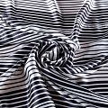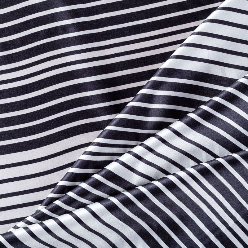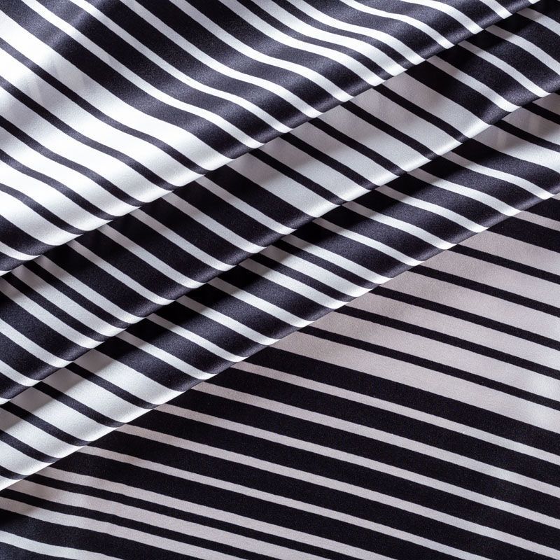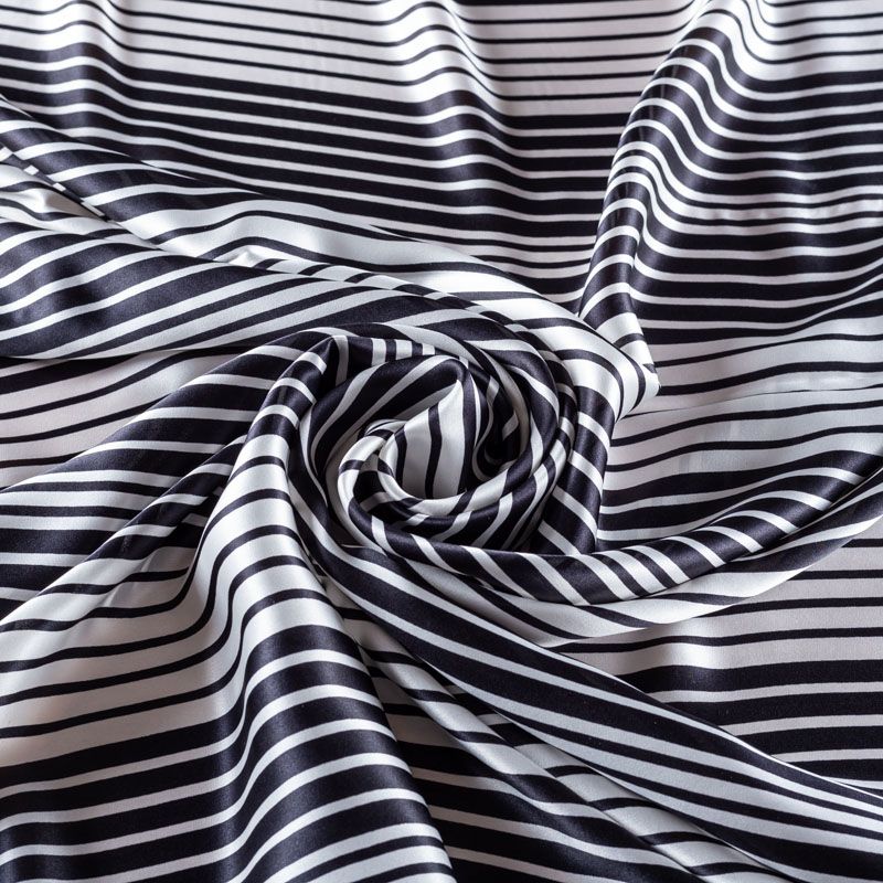 Натуральный шелк с атласной поверхностью, легкий, струящийся, хорошо драпируется. Черно-белая вертикальная полоска будет уместна для пошива летнего сарафана, платья, блузки, костюма в пижамном стиле, широких брюк или юбки.