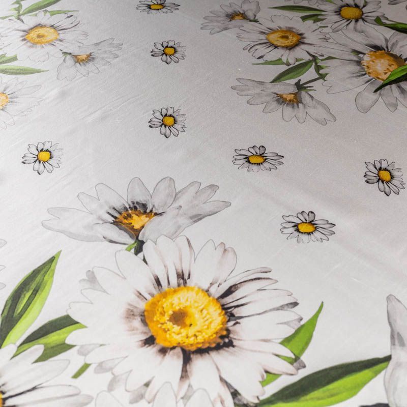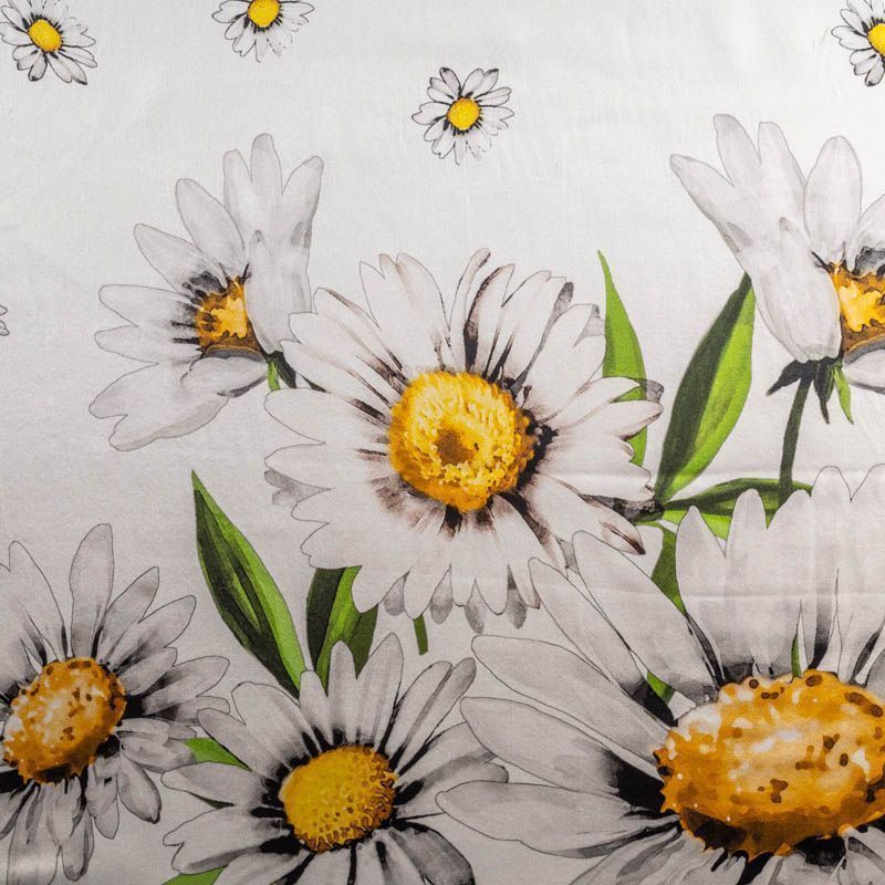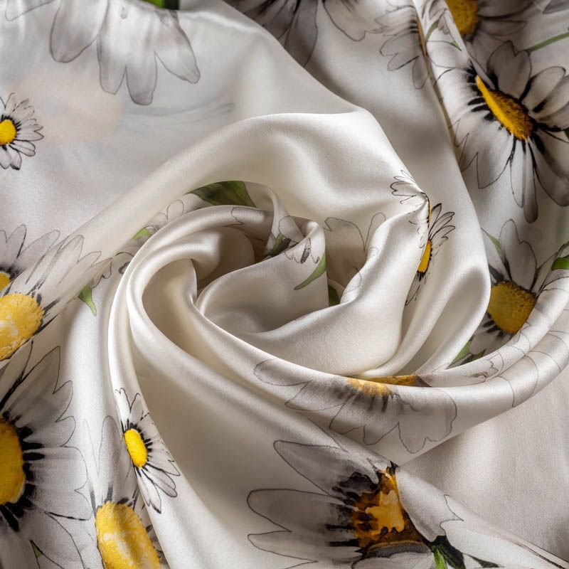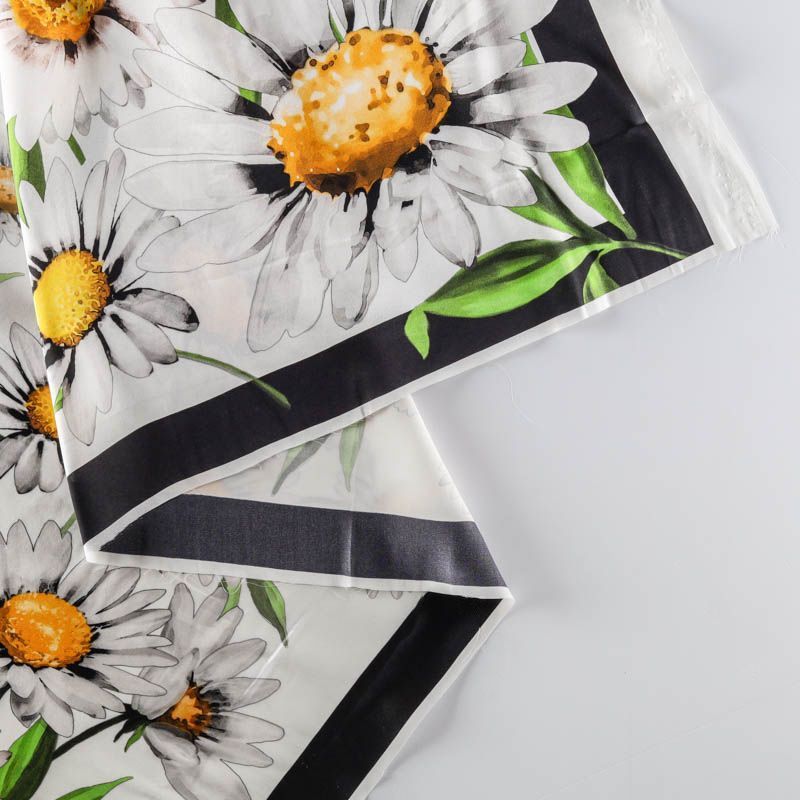 Эффектный и стильный шелк-купон с крупными ромашками на молочном фоне с черным кантом. Такой принт добавит свежести и весеннего настроения в любой образ. Ткань-платок выполнена из натурального итальянского шелка атласного плетения. Шелк средней плотности, не просвечивает, струится, хорошо драпируется. Поверхность глядкая, имеет благородный сатиновый блеск. Подойдет для летних платьев, накидок, юбок, блузок, костюмов, широких брюк, домашней одежды, шейных платков.
