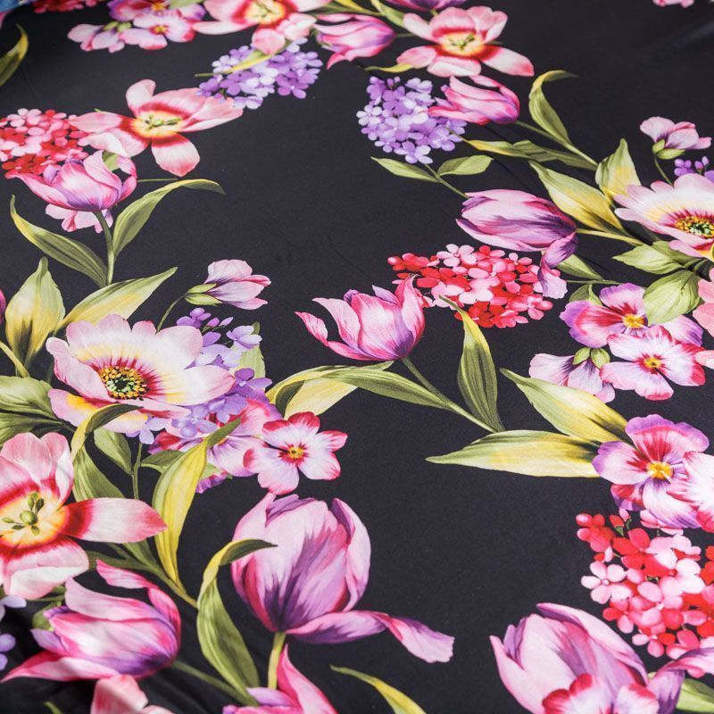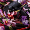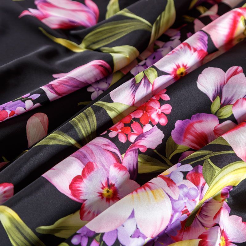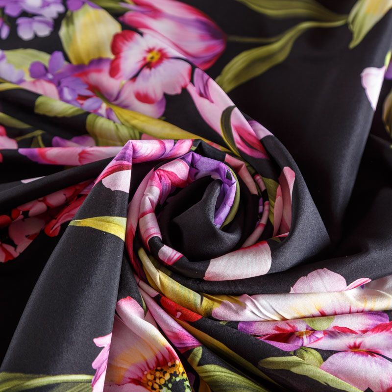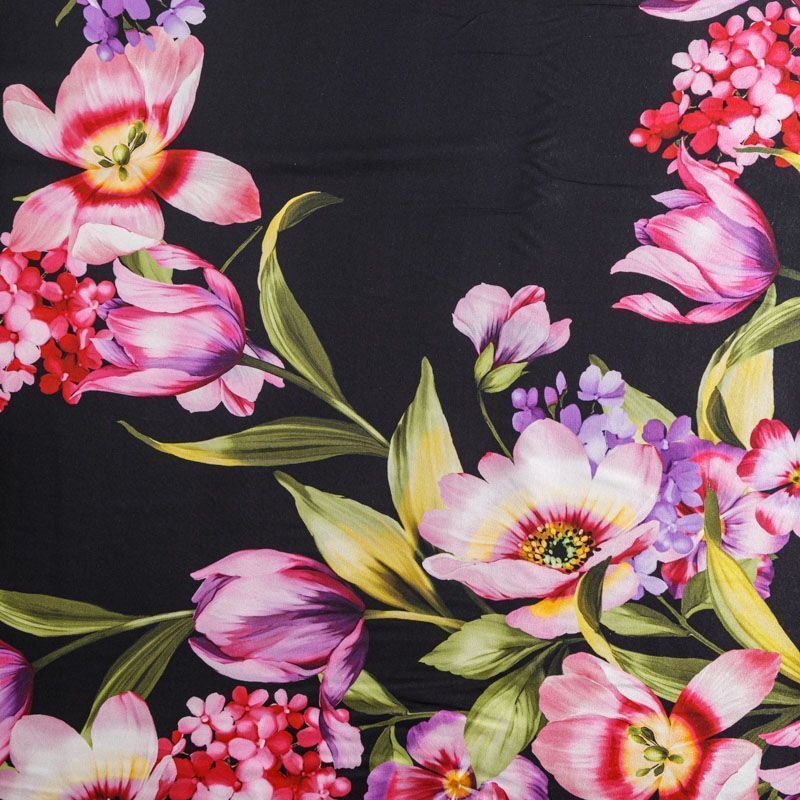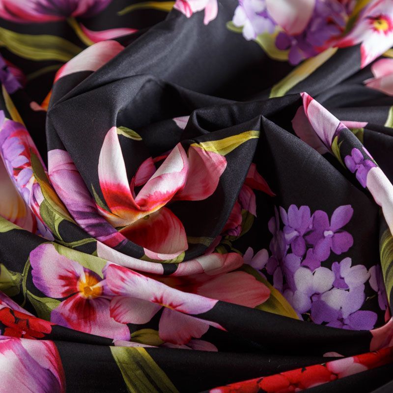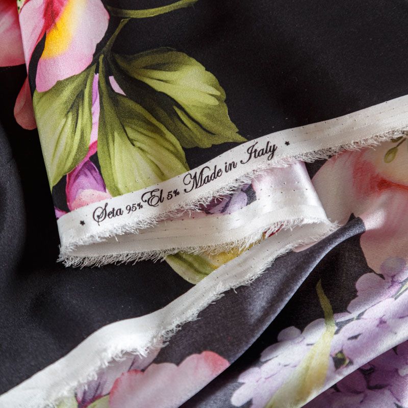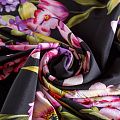 Итальянский матовый шелк с цветочным принтом на черном фоне. Ткань тонкая, не просвечивает, изнанка атласная, отлично драпируется, легкая и струящаяся. Идеально подойдет для пошива платьев и сарафанов расклешенных моделей, с воланами, летящих юбок, топов, блузки, костюма в пижамном стиле.